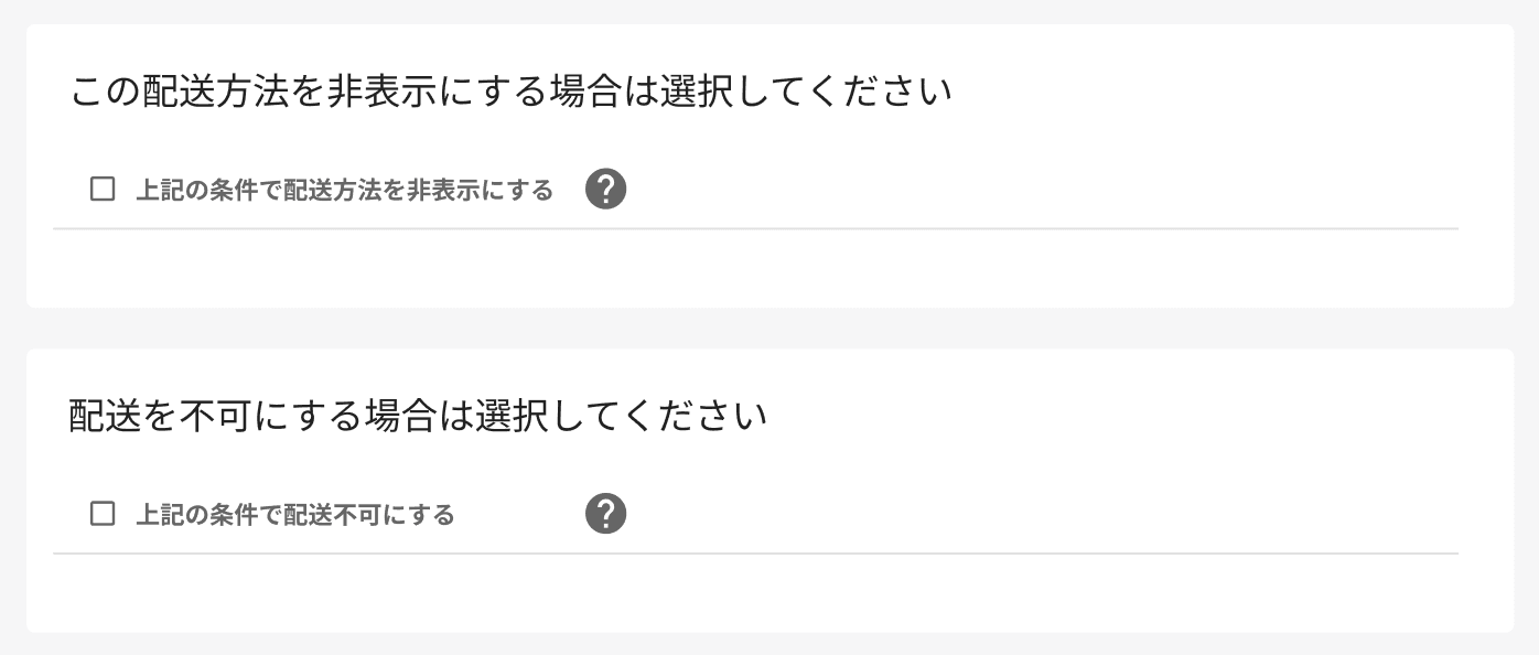 - 既存の「配送方法の非表示」については実態に即して、文言を「配送を不可」に変更。 チェックを入れた場合は既存仕様と同様、配送自体が不可になる。